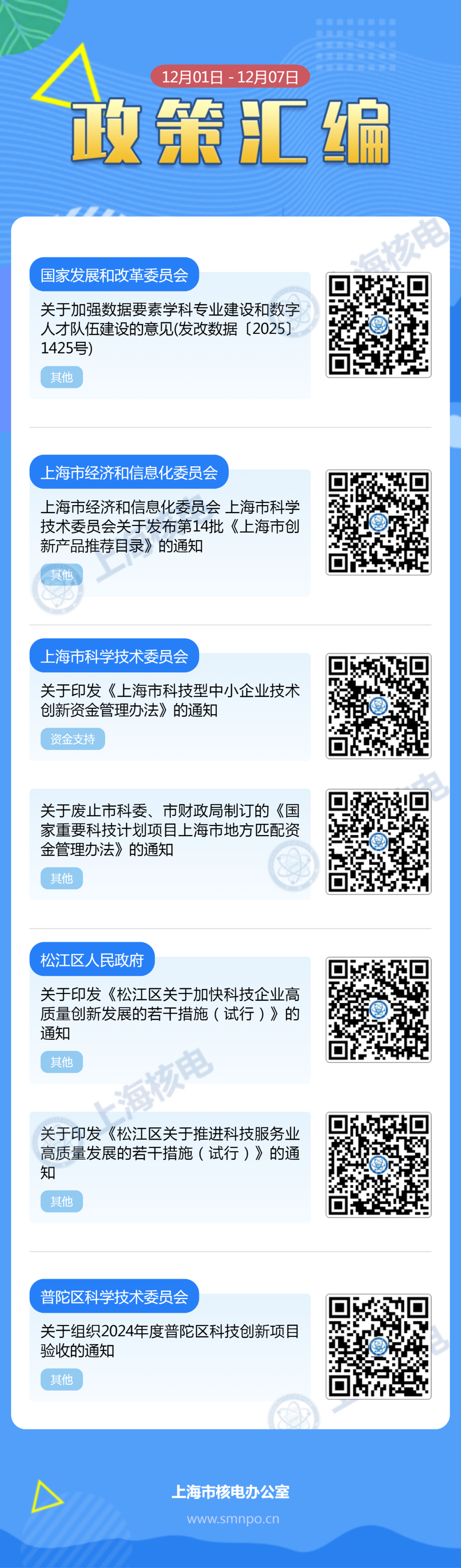 为进一步服务好上海涉核企业,让企业及时了解相关惠企政策,“上海核电”微信公众号推出“政策汇编”栏目,定期梳理和汇总国家、上海市及各区在近一周内出台的重大产业政策以及专项资金项目申报和指南等,提供相关政策参考。